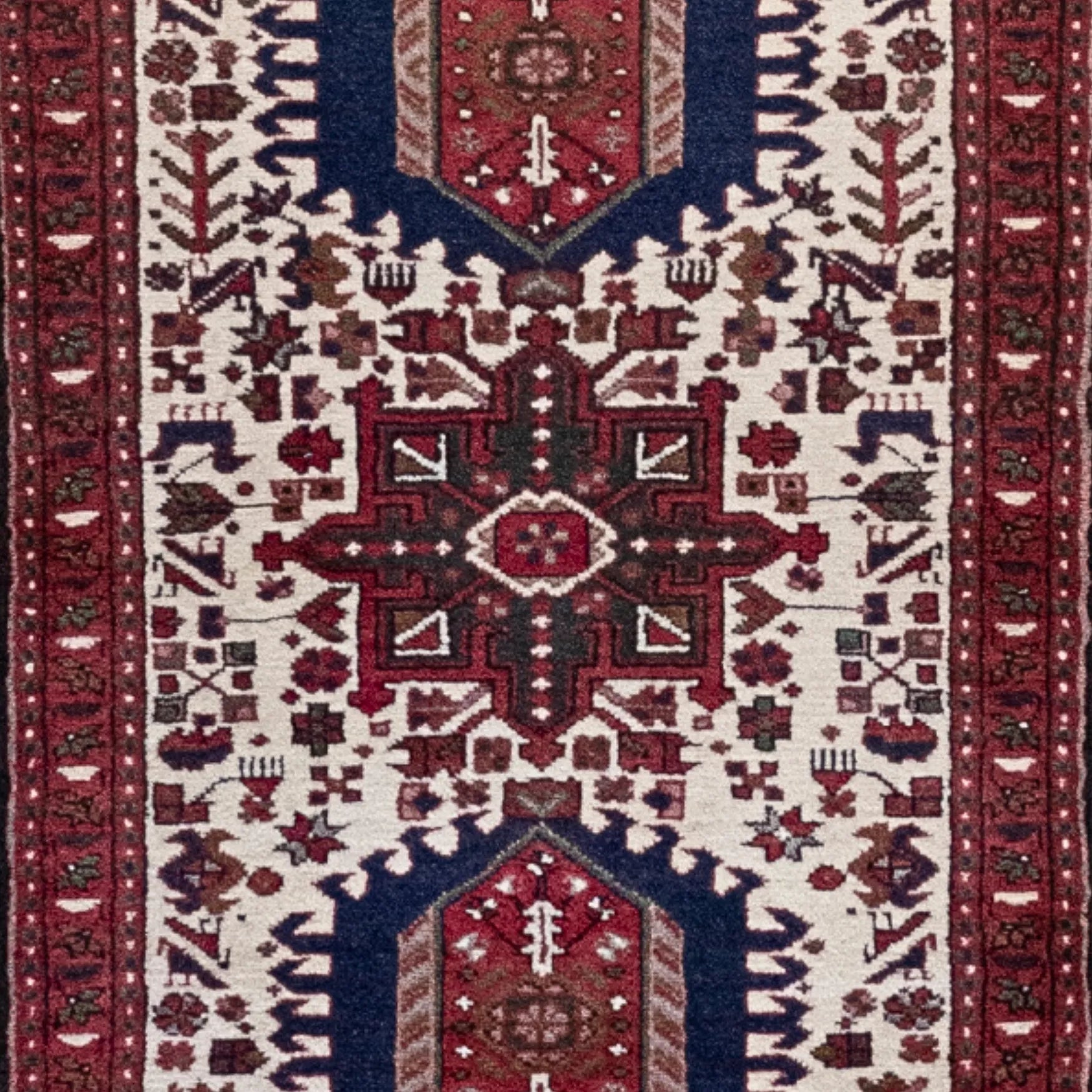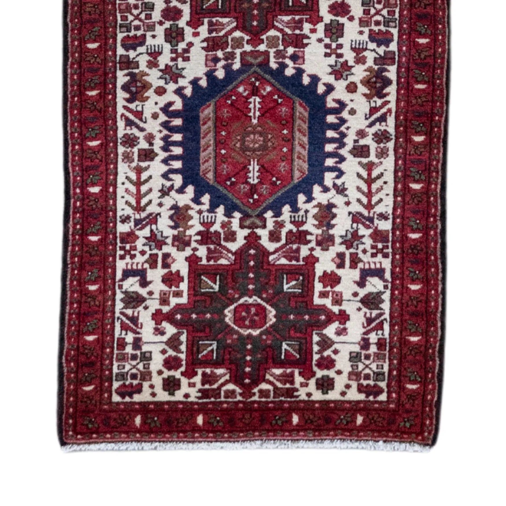 Add a Bold Touch with GEOMETRIC Style. This stunning KARAJEH rug, crafted in a striking geometric style, brings a modern and bold look to your home. The clean, sharp lines and symmetrical patterns on the BEIGE base create a dynamic visual effect, making this rug a perfect statement piece. The contrasting RED border adds a touch of sophistication, enhancing the overall design. Whether placed in your living room, office, or any open space, the geometric pattern brings structure and energy to the decor. Sourced from PERSIAN, this handmade rug is a long-lasting investment in craftsmanship and style. Measuring 2' 4" x 9' 6" (imperial) or 71 x 289 (metric), it not only elevates your space but is built to stand the test of time.
