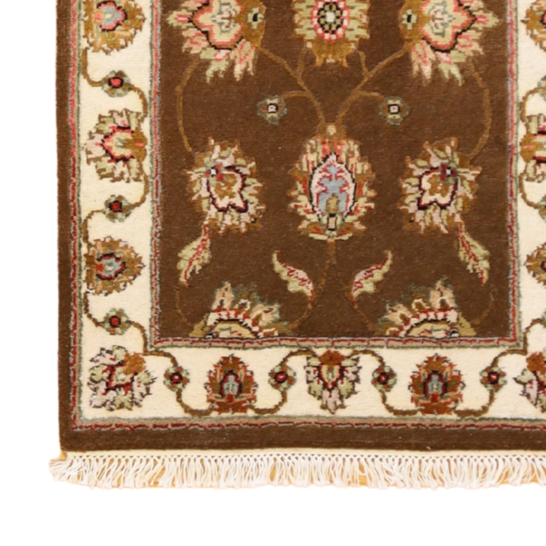 Made from premium SILK&WOOL, it offers a blend of lasting durability and a soft, comfortable feel. The deep BROWN base is elegantly framed with a IVORY border, creating a balanced and stylish look.