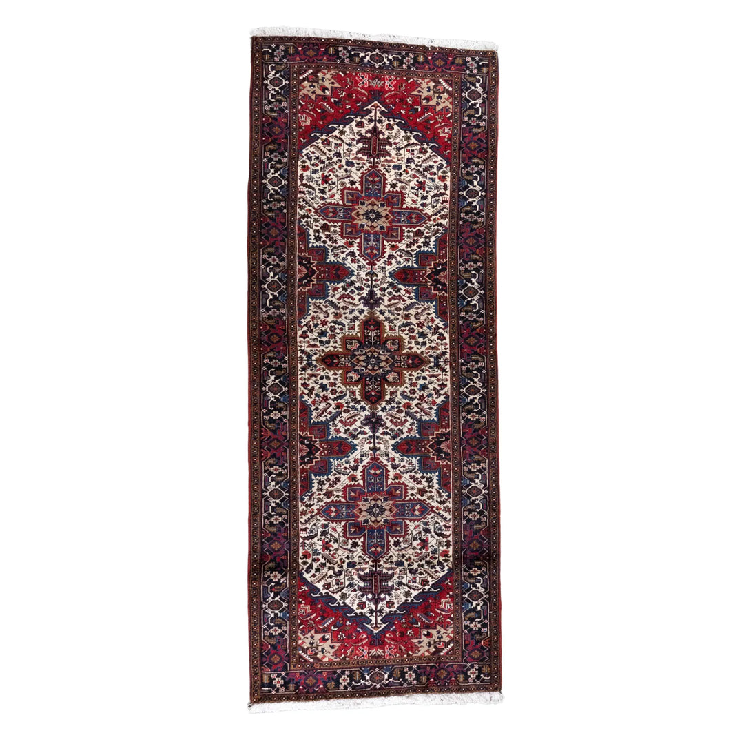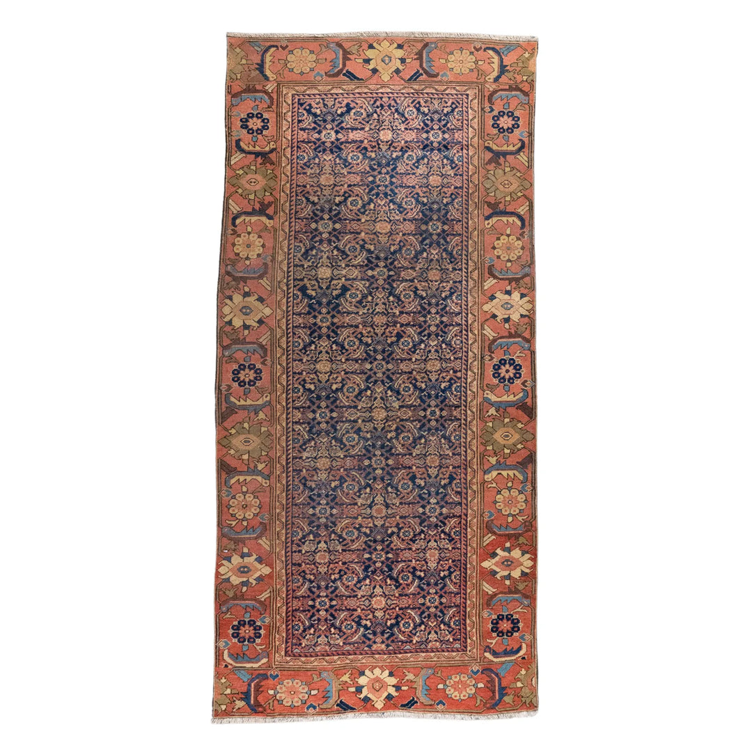 4' 11" x 12' 10" - RED AND NAVY HERIZ GEOMETRIC PERSIAN RUG ( 150 x 391 CM )