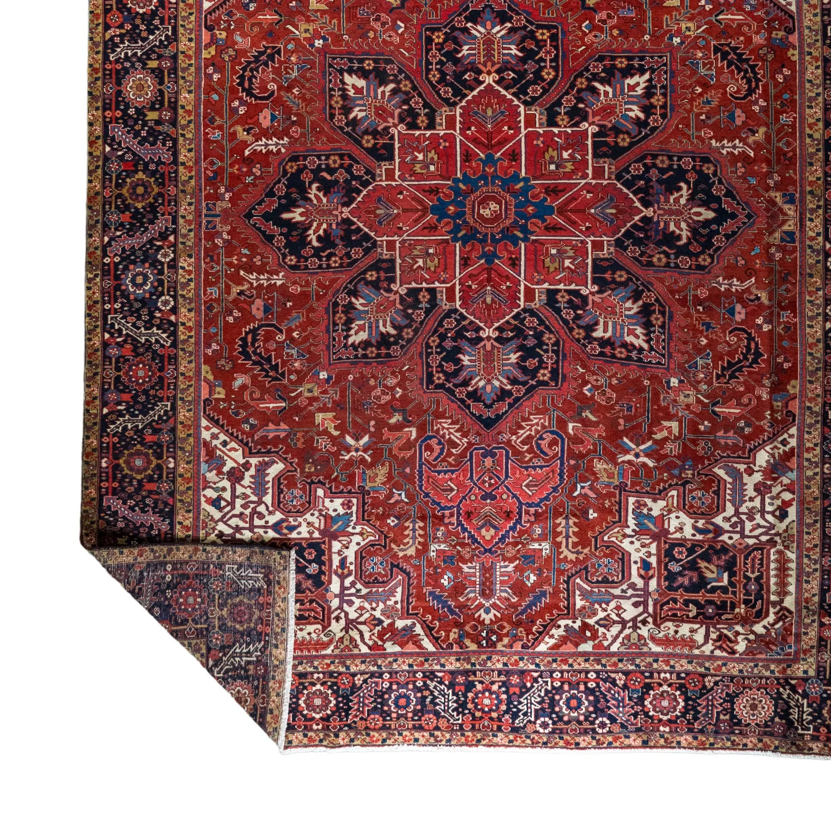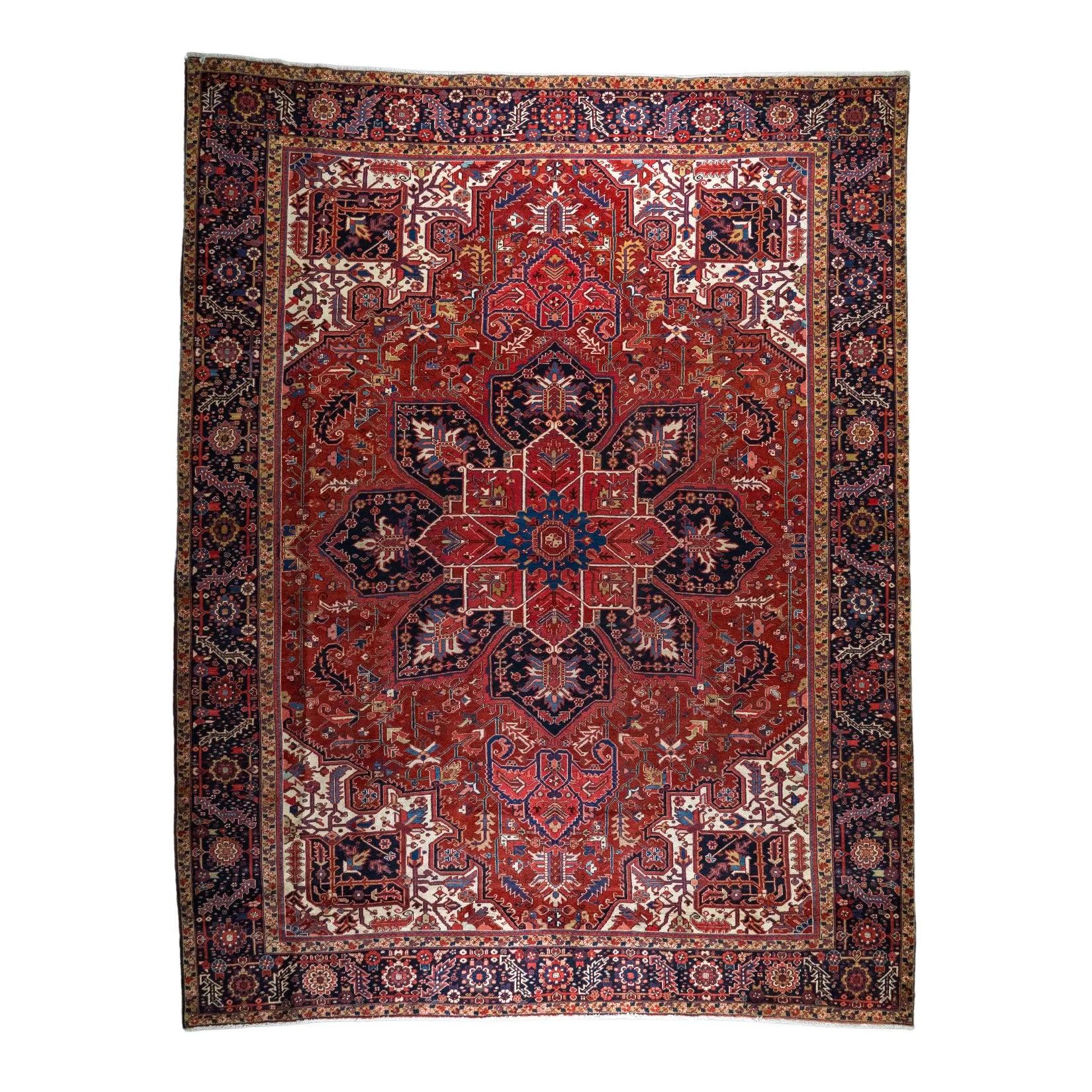 Add a Bold Touch with GEOMETRIC Style. This stunning HERIZ rug, crafted in a striking geometric style, brings a modern and bold look to your home. The clean, sharp lines and symmetrical patterns on the RED base create a dynamic visual effect, making this rug a perfect statement piece. The contrasting NAVY border adds a touch of sophistication, enhancing the overall design. Whether placed in your living room, office, or any open space, the geometric pattern brings structure and energy to the decor. Sourced from PERSIAN, this handmade rug is a long-lasting investment in craftsmanship and style. Measuring 11' 4" x 14' 6" (imperial) or 345 x 442 (metric), it not only elevates your space but is built to stand the test of time.