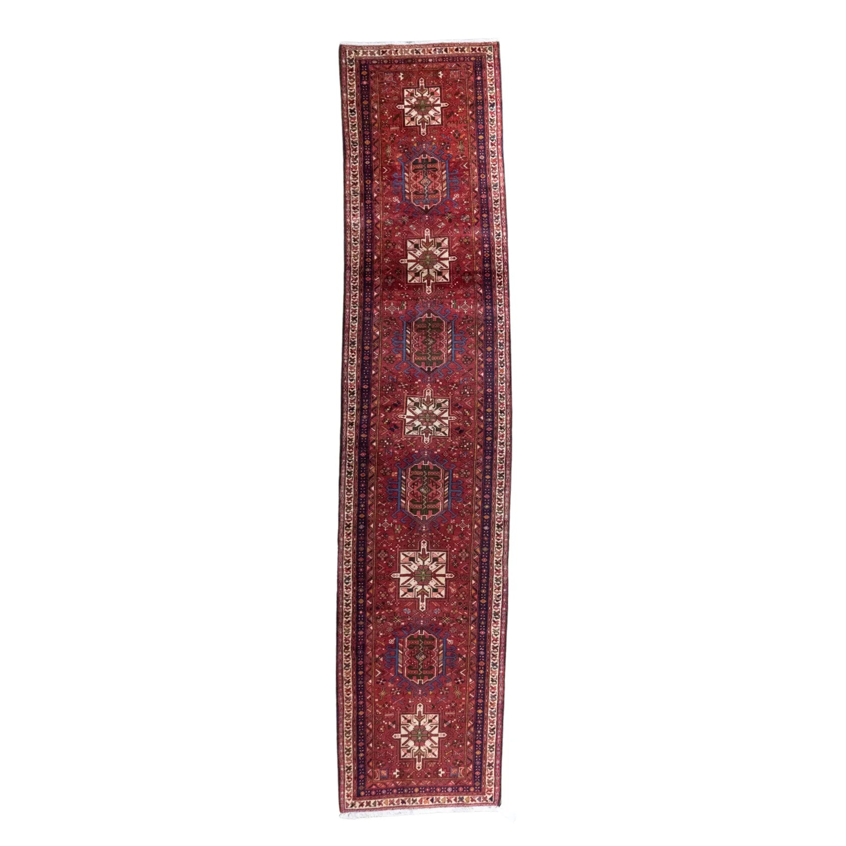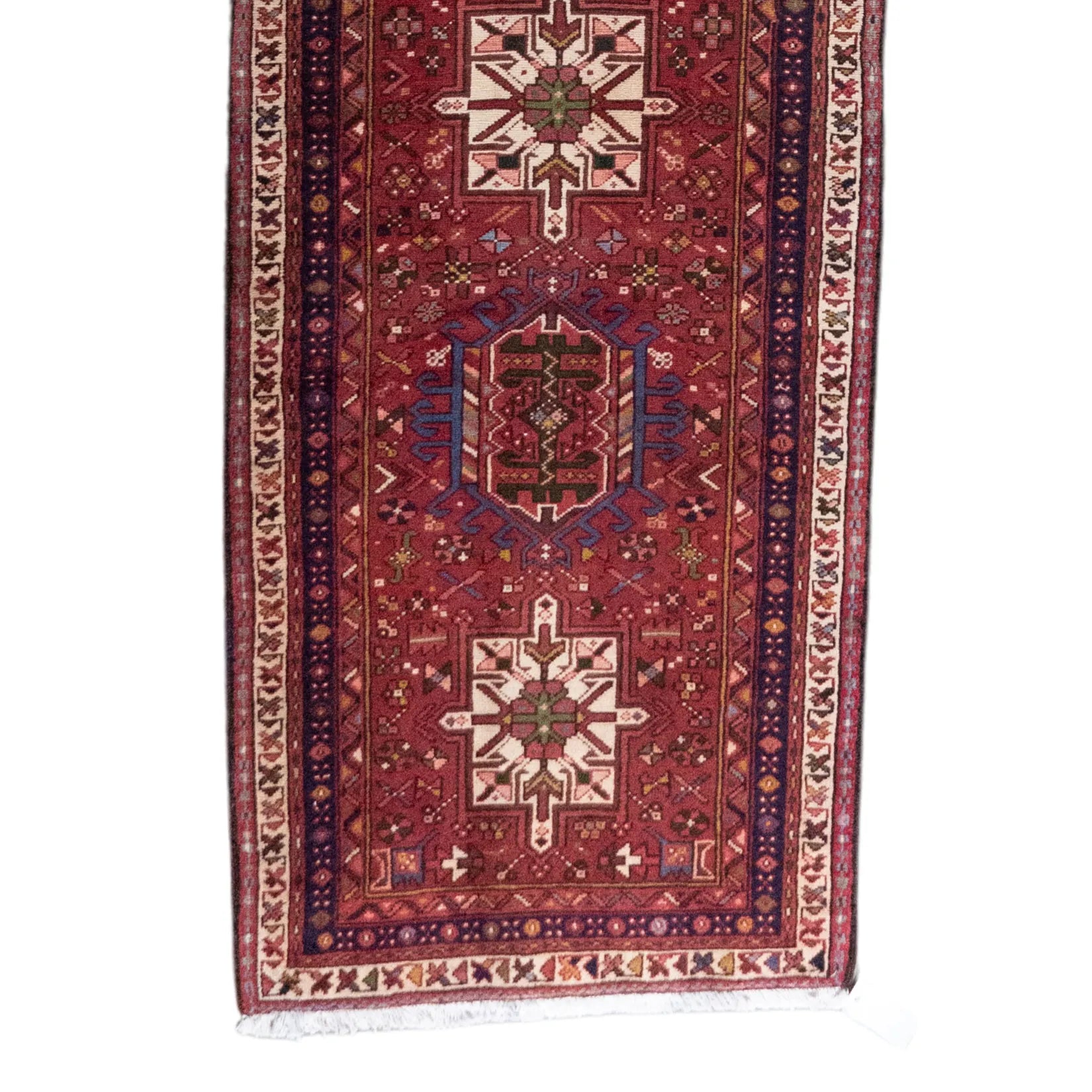 Add a Bold Touch with GEOMETRIC Style. This stunning KARAJEH rug, crafted in a striking geometric style, brings a modern and bold look to your home. The clean, sharp lines and symmetrical patterns on the RED base create a dynamic visual effect, making this rug a perfect statement piece. The contrasting NAVY border adds a touch of sophistication, enhancing the overall design. Whether placed in your living room, office, or any open space, the geometric pattern brings structure and energy to the decor. Sourced from PERSIAN, this handmade rug is a long-lasting investment in craftsmanship and style. Measuring 2' 11" x 13' 7" (imperial) or 89 x 414 (metric), it not only elevates your space but is built to stand the test of time.