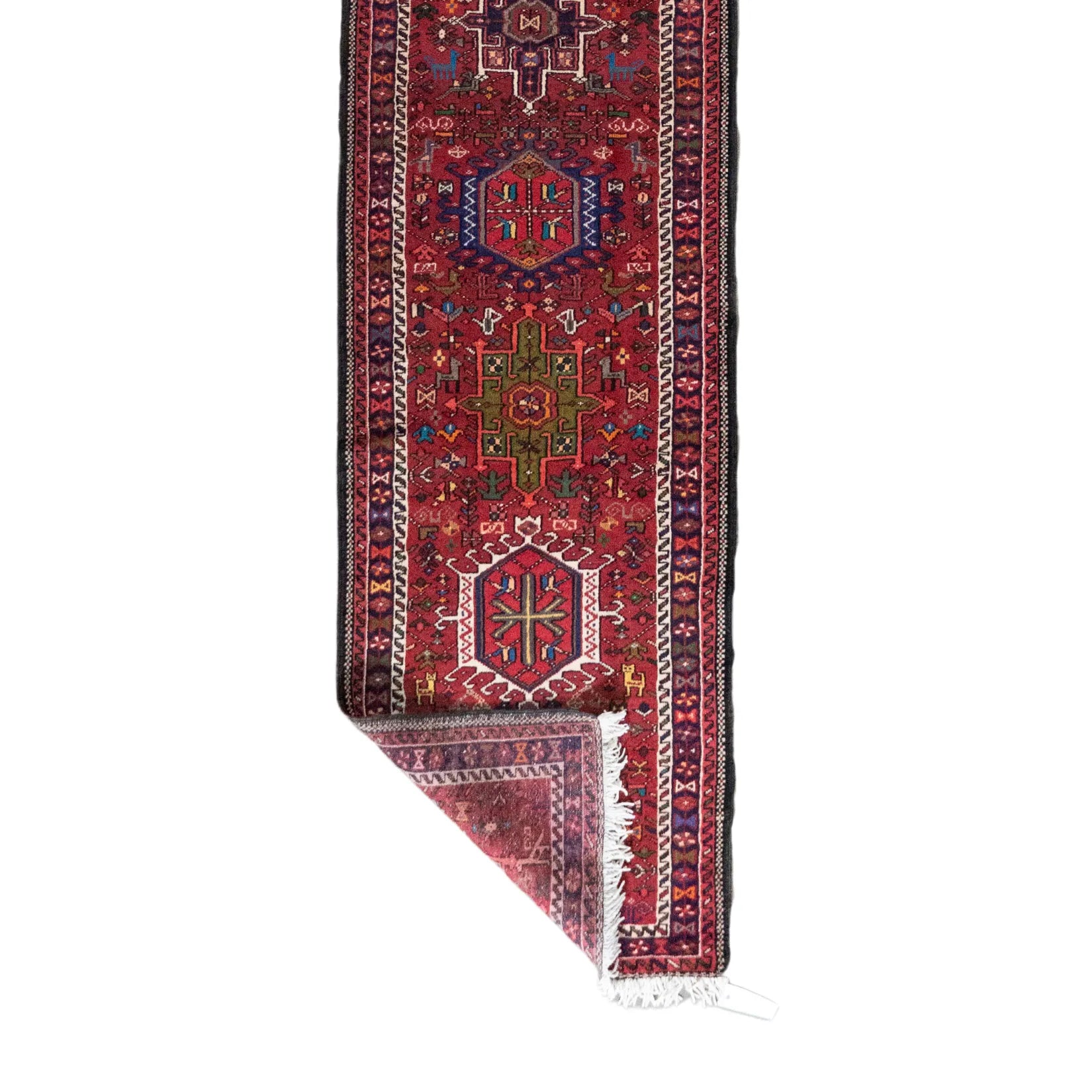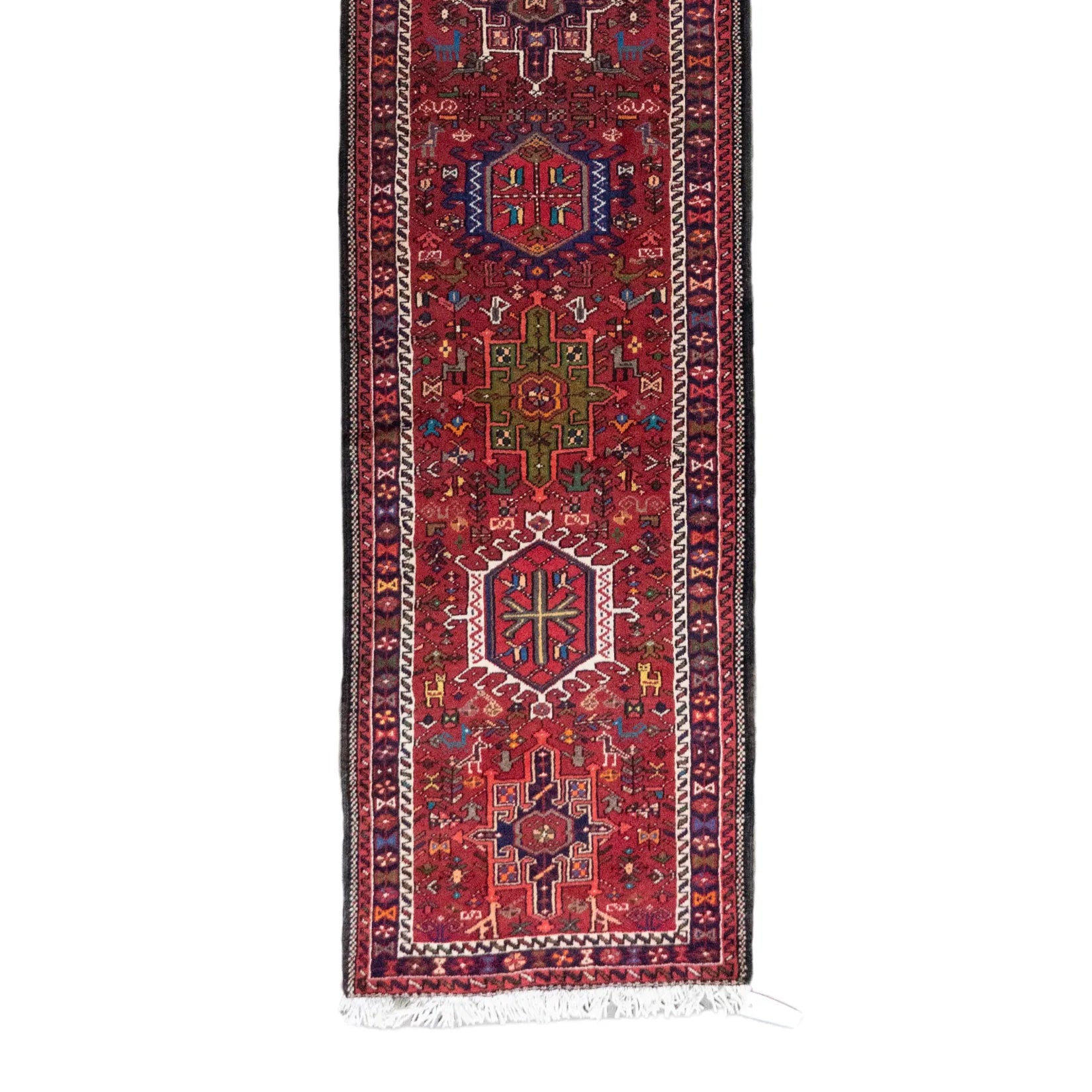 Add a Bold Touch with GEOMETRIC Style. This stunning KARAJEH rug, crafted in a striking geometric style, brings a modern and bold look to your home. The clean, sharp lines and symmetrical patterns on the RED base create a dynamic visual effect, making this rug a perfect statement piece. The contrasting NAVY border adds a touch of sophistication, enhancing the overall design. Whether placed in your living room, office, or any open space, the geometric pattern brings structure and energy to the decor. Sourced from PERSIAN, this handmade rug is a long-lasting investment in craftsmanship and style. Measuring 2' 6" x 13' 9" (imperial) or 76 x 419 (metric), it not only elevates your space but is built to stand the test of time.