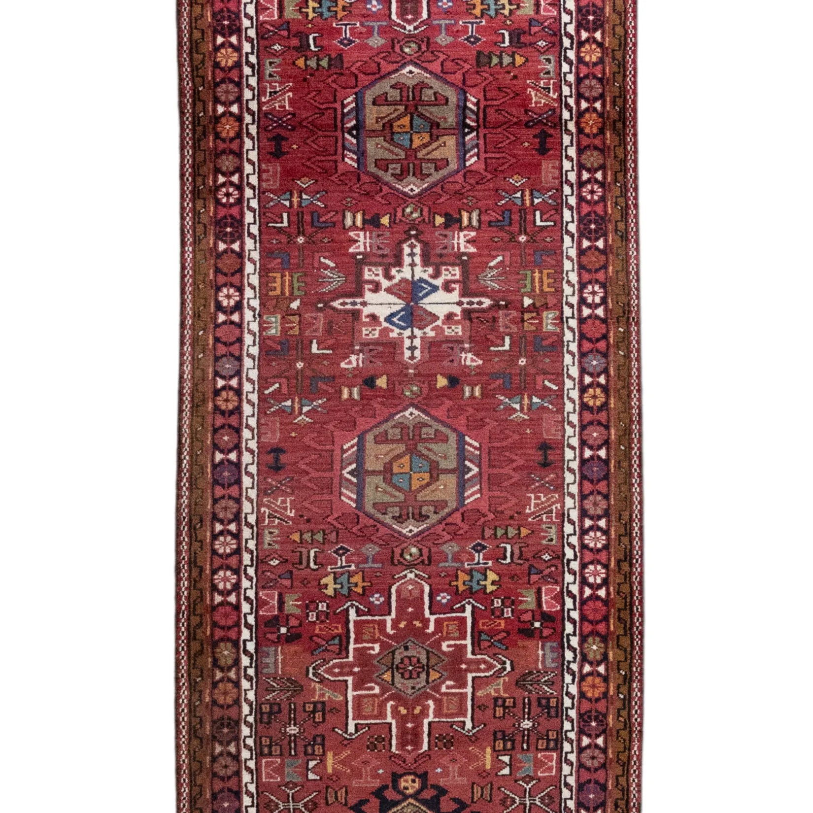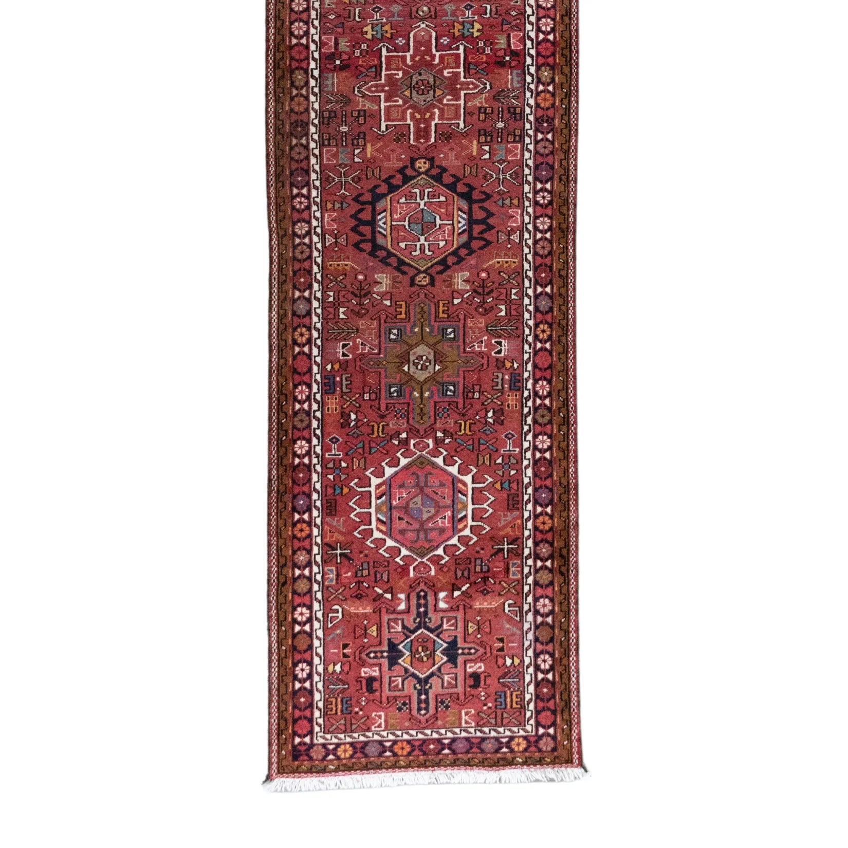 Add a Bold Touch with GEOMETRIC Style. This stunning KARAJEH rug, crafted in a striking geometric style, brings a modern and bold look to your home. The clean, sharp lines and symmetrical patterns on the RED base create a dynamic visual effect, making this rug a perfect statement piece. The contrasting NAVY border adds a touch of sophistication, enhancing the overall design. Whether placed in your living room, office, or any open space, the geometric pattern brings structure and energy to the decor. Sourced from PERSIAN, this handmade rug is a long-lasting investment in craftsmanship and style. Measuring 2' 7" x 15' 7" (imperial) or 79 x 475 (metric), it not only elevates your space but is built to stand the test of time.