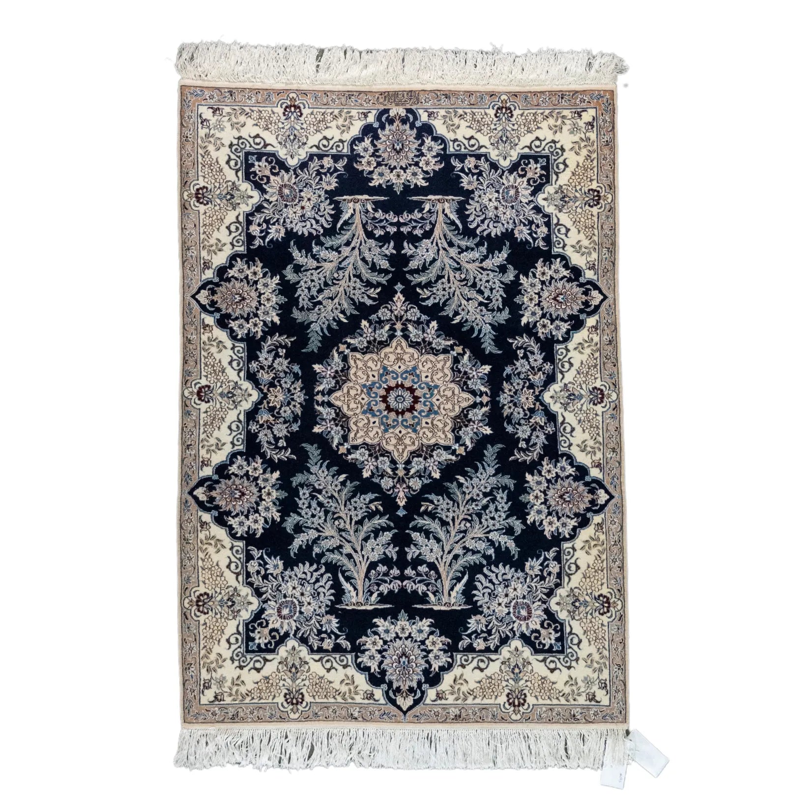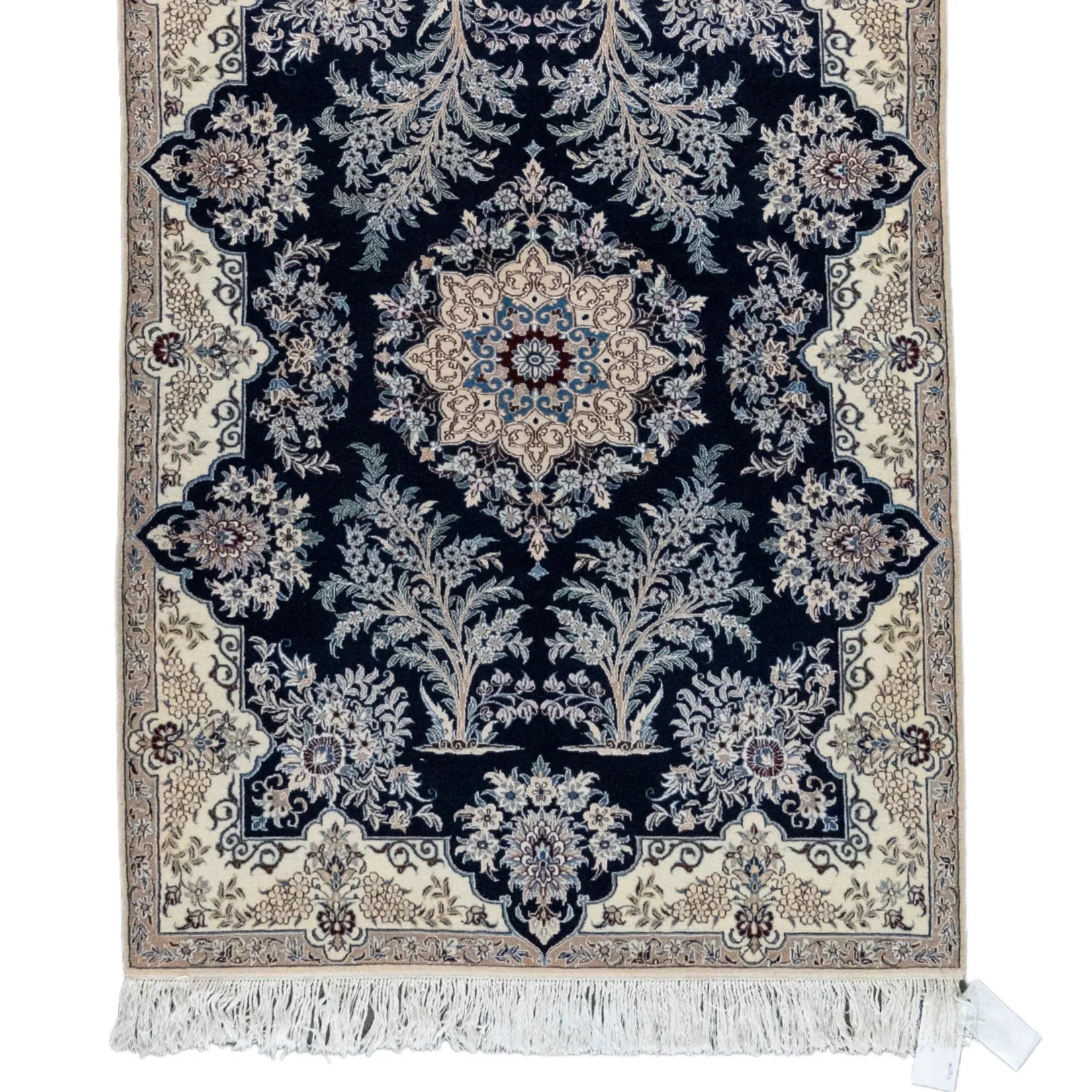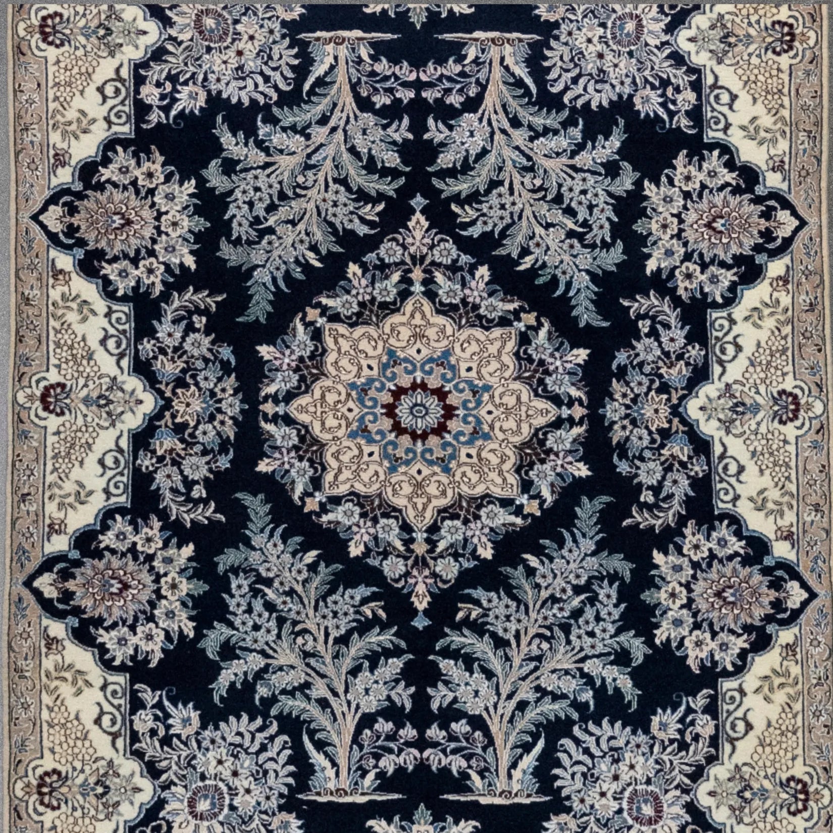 Enhance Your Space with Classic FLORAL Beauty. This beautiful NAEIN rug, crafted in a classic FLORAL style, brings a warm, welcoming feel to your home. The rich NAVY background, combined with its elegant BEIGE border, creates a bold yet timeless look. The soft colors and intricate design make this rug perfect for adding character and style to your living room, dining area, or any space that needs a fresh update. Sourced from PERSIAN, this handmade rug is not only a stunning decorative piece but also a valuable investment in quality craftsmanship. Measuring 3' 5" x 4' 10" (imperial) or 104 x 147 (metric), its durable construction ensures it will last for years, making it a timeless addition to your decor.