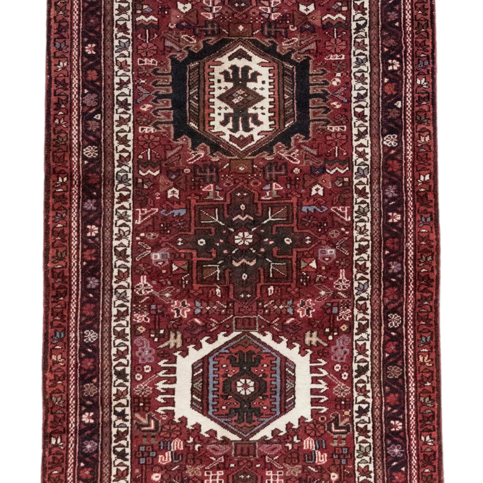 Add a Bold Touch with GEOMETRIC Style. This stunning KARAJEH rug, crafted in a striking geometric style, brings a modern and bold look to your home. The clean, sharp lines and symmetrical patterns on the RED base create a dynamic visual effect, making this rug a perfect statement piece. The contrasting RED border adds a touch of sophistication, enhancing the overall design. Whether placed in your living room, office, or any open space, the geometric pattern brings structure and energy to the decor. Sourced from PERSIAN, this handmade rug is a long-lasting investment in craftsmanship and style. Measuring 3' 5" x 9' 2" (imperial) or 104 x 279 (metric), it not only elevates your space but is built to stand the test of time.