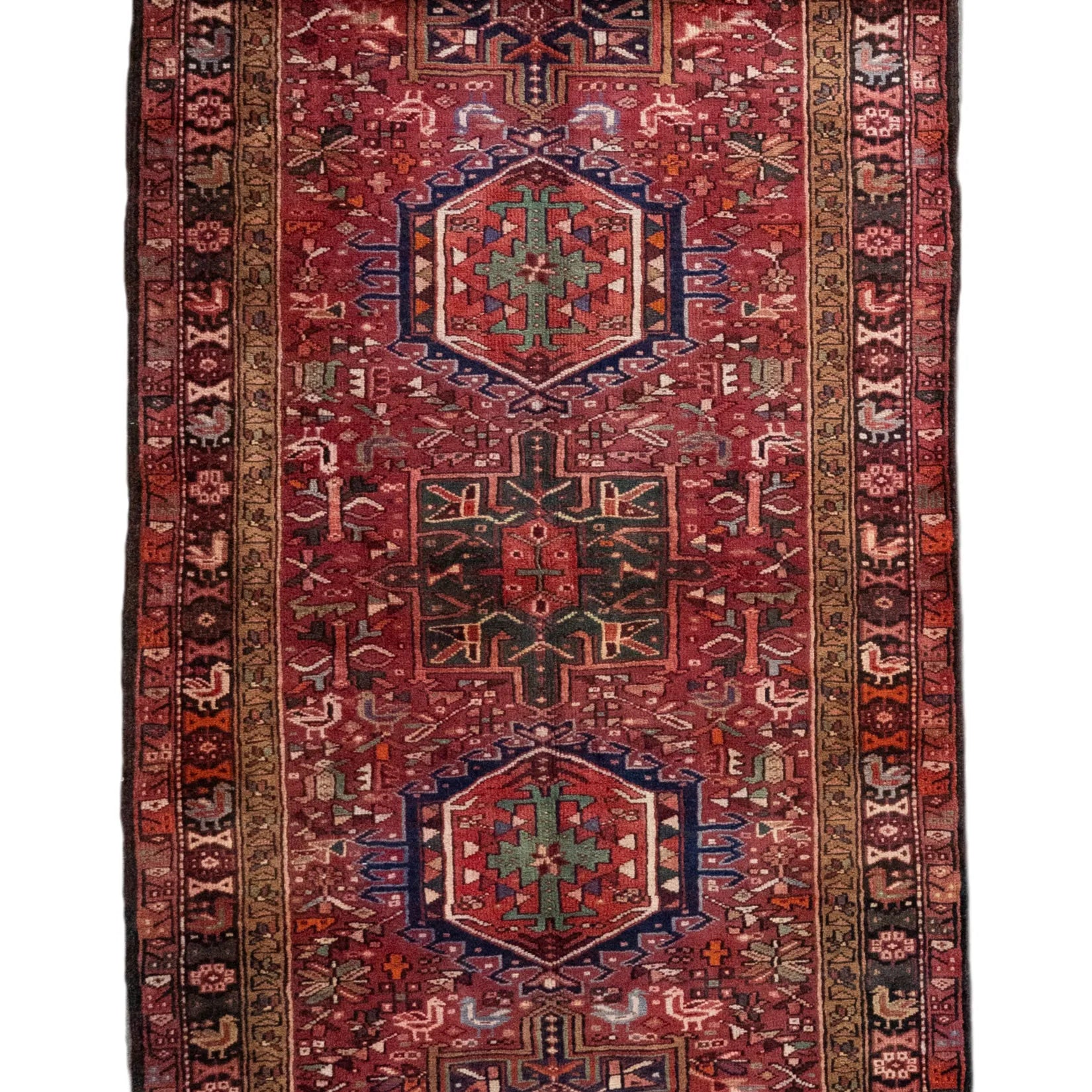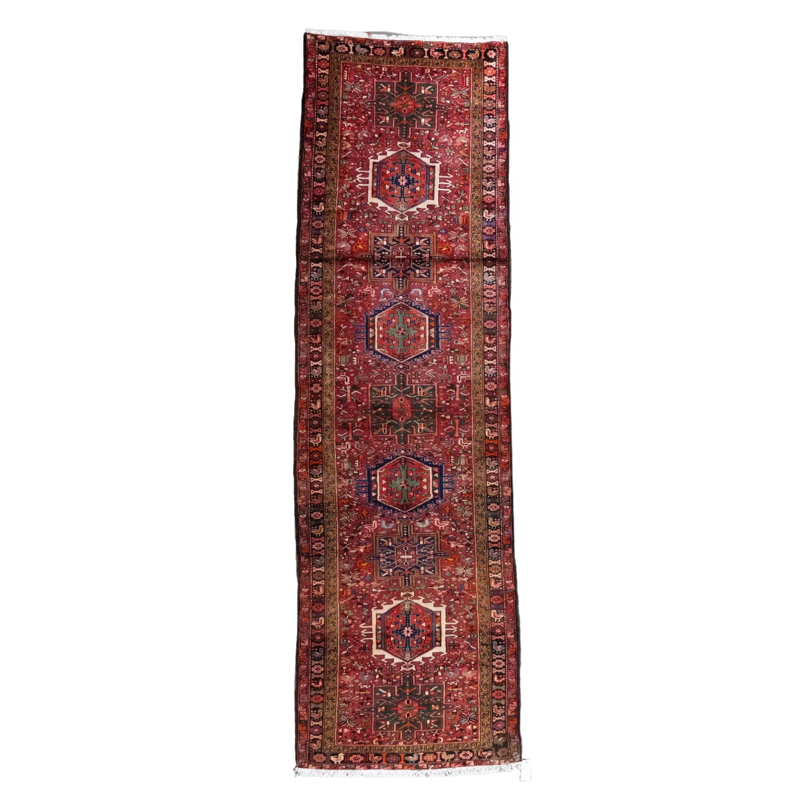 Add a Bold Touch with GEOMETRIC Style. This stunning KARAJEH rug, crafted in a striking geometric style, brings a modern and bold look to your home. The clean, sharp lines and symmetrical patterns on the RED base create a dynamic visual effect, making this rug a perfect statement piece. The contrasting NAVY border adds a touch of sophistication, enhancing the overall design. Whether placed in your living room, office, or any open space, the geometric pattern brings structure and energy to the decor. Sourced from PERSIAN, this handmade rug is a long-lasting investment in craftsmanship and style. Measuring 3' 9" x 12' 10" (imperial) or 114 x 391 (metric), it not only elevates your space but is built to stand the test of time.