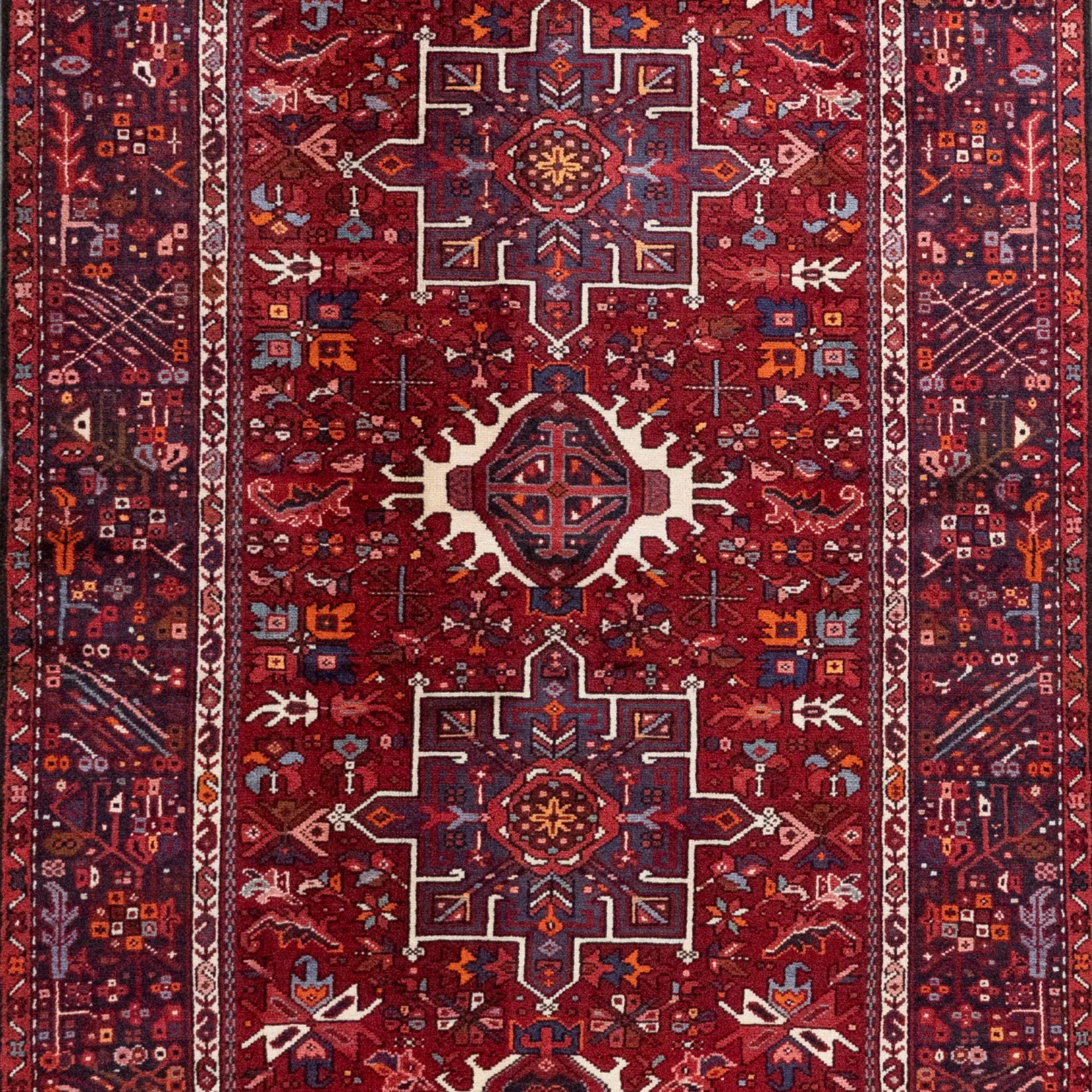 Add a Bold Touch with GEOMETRIC Style. This stunning KARAJEH rug, crafted in a striking geometric style, brings a modern and bold look to your home. The clean, sharp lines and symmetrical patterns on the RED base create a dynamic visual effect, making this rug a perfect statement piece. The contrasting BLUE border adds a touch of sophistication, enhancing the overall design. Whether placed in your living room, office, or any open space, the geometric pattern brings structure and energy to the decor. Sourced from PERSIAN, this handmade rug is a long-lasting investment in craftsmanship and style. Measuring 4' 10" x 13' 1" (imperial) or 147 x 399 (metric), it not only elevates your space but is built to stand the test of time.