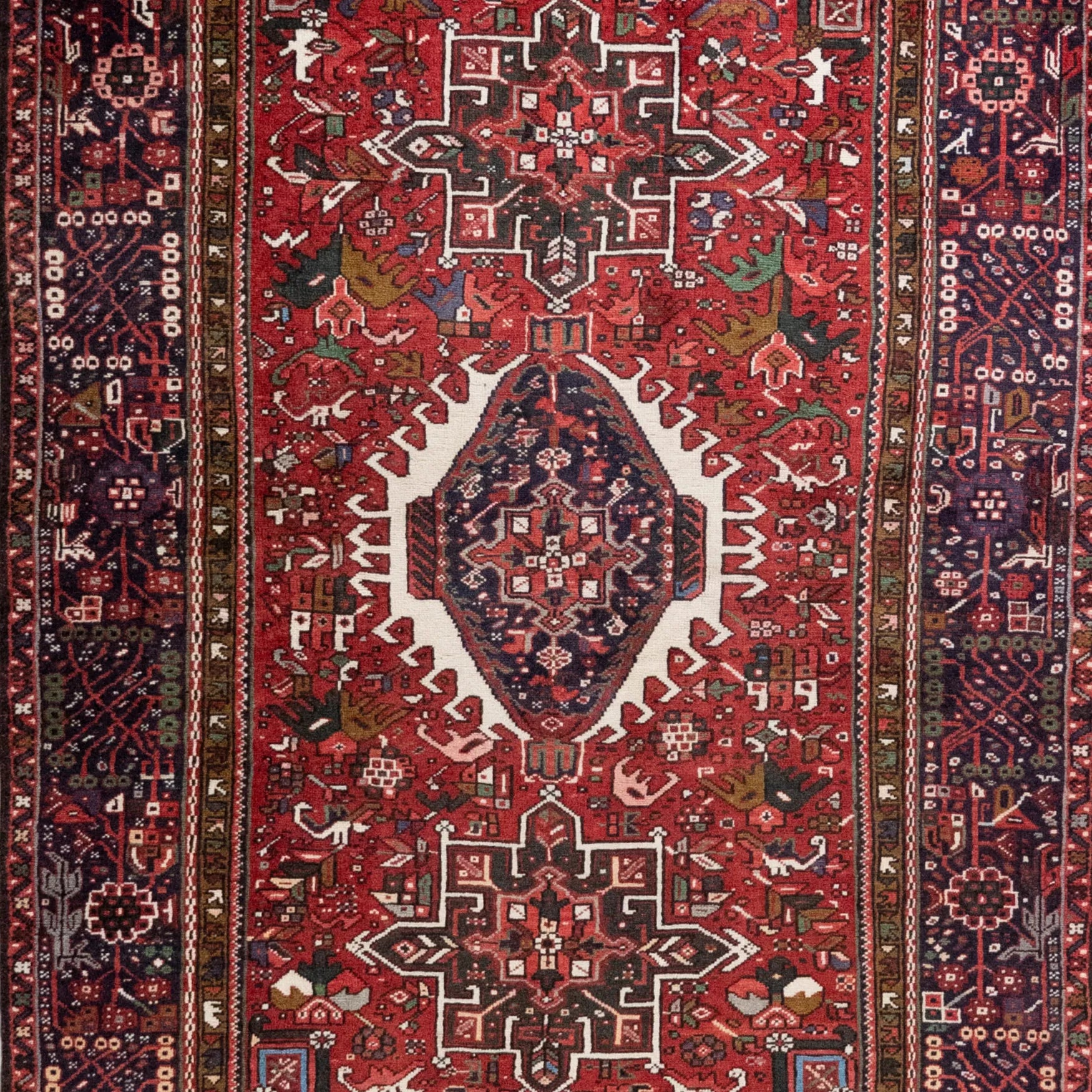 Add a Bold Touch with GEOMETRIC Style. This stunning KARAJEH rug, crafted in a striking geometric style, brings a modern and bold look to your home. The clean, sharp lines and symmetrical patterns on the RED base create a dynamic visual effect, making this rug a perfect statement piece. The contrasting NAVY border adds a touch of sophistication, enhancing the overall design. Whether placed in your living room, office, or any open space, the geometric pattern brings structure and energy to the decor. Sourced from PERSIAN, this handmade rug is a long-lasting investment in craftsmanship and style. Measuring 4' 9" x 6' 6" (imperial) or 145 x 198 (metric), it not only elevates your space but is built to stand the test of time.