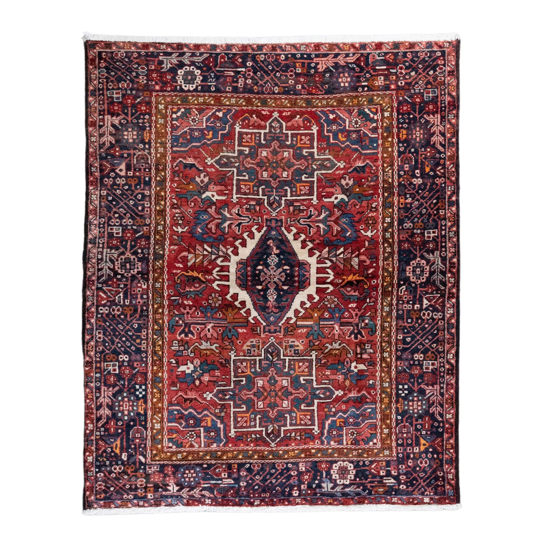 Add a Bold Touch with GEOMETRIC Style. This stunning KARAJEH rug, crafted in a striking geometric style, brings a modern and bold look to your home. The clean, sharp lines and symmetrical patterns on the RED base create a dynamic visual effect, making this rug a perfect statement piece. The contrasting NAVY border adds a touch of sophistication, enhancing the overall design. Whether placed in your living room, office, or any open space, the geometric pattern brings structure and energy to the decor. Sourced from PERSIAN, this handmade rug is a long-lasting investment in craftsmanship and style. Measuring 5' 1" x 6' 3" (imperial) or 155 x 190 (metric), it not only elevates your space but is built to stand the test of time.