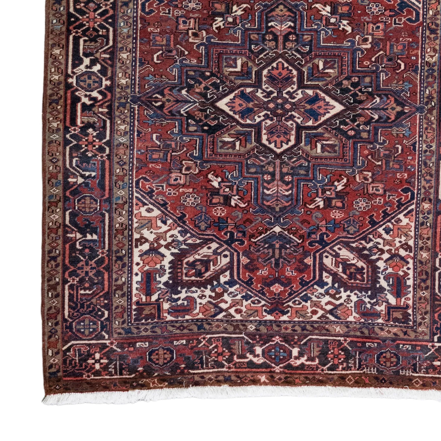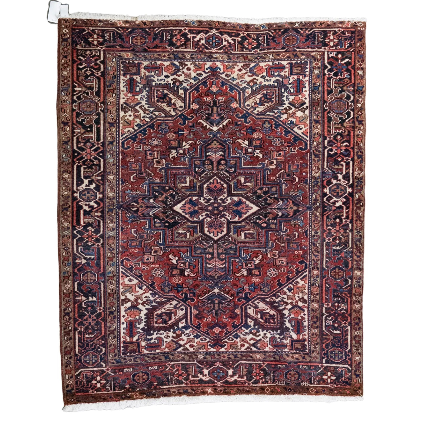 Add a Bold Touch with GEOMETRIC Style. This stunning HERIZ rug, crafted in a striking geometric style, brings a modern and bold look to your home. The clean, sharp lines and symmetrical patterns on the RED base create a dynamic visual effect, making this rug a perfect statement piece. The contrasting NAVY border adds a touch of sophistication, enhancing the overall design. Whether placed in your living room, office, or any open space, the geometric pattern brings structure and energy to the decor. Sourced from PERSIAN, this handmade rug is a long-lasting investment in craftsmanship and style. Measuring 5' 3" x 6' 6" (imperial) or 160 x 198 (metric), it not only elevates your space but is built to stand the test of time.