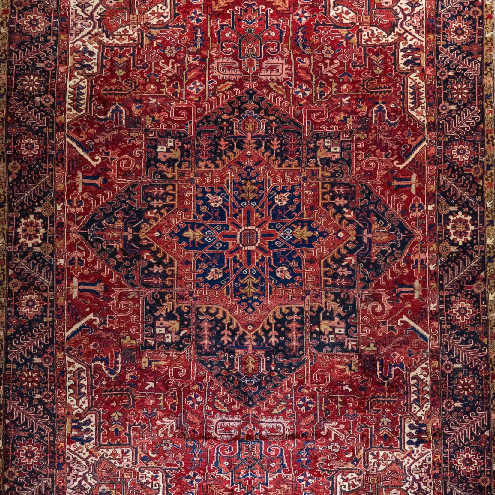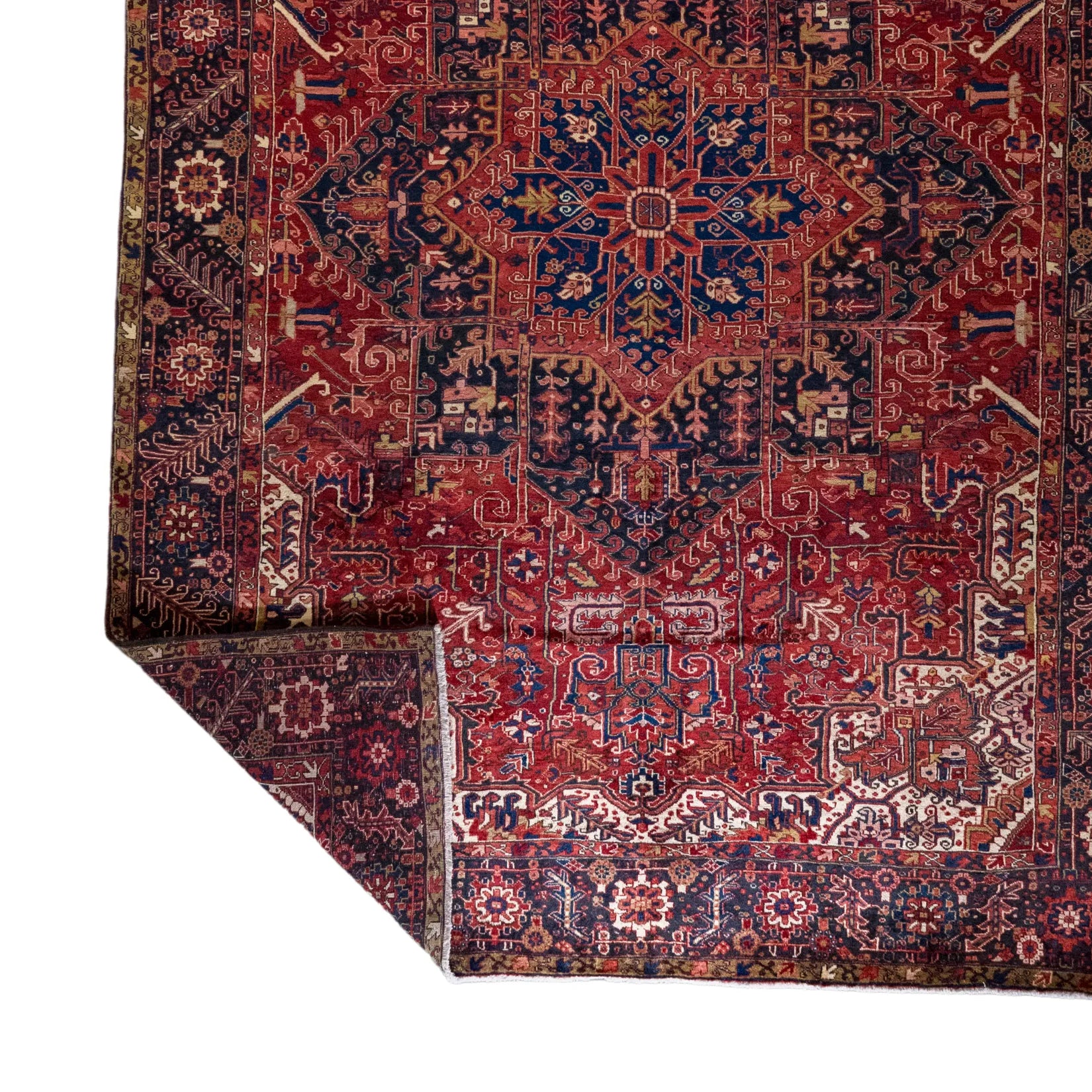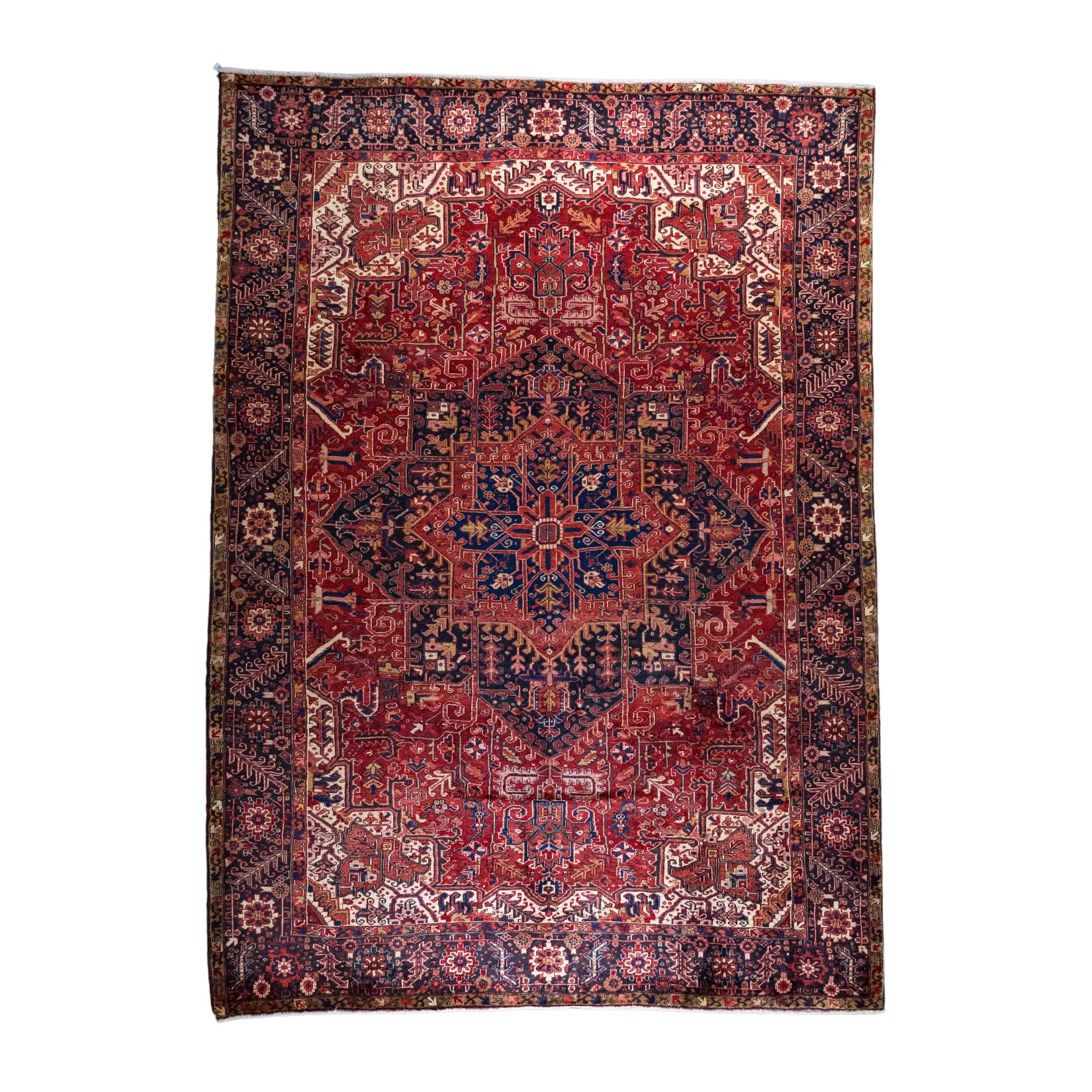 Add a Bold Touch with GEOMETRIC Style. This stunning HERIZ rug, crafted in a striking geometric style, brings a modern and bold look to your home. The clean, sharp lines and symmetrical patterns on the NAVY base create a dynamic visual effect, making this rug a perfect statement piece. The contrasting RED border adds a touch of sophistication, enhancing the overall design. Whether placed in your living room, office, or any open space, the geometric pattern brings structure and energy to the decor. Sourced from PERSIAN, this handmade rug is a long-lasting investment in craftsmanship and style. Measuring 9' 5" x 13' 3" (imperial) or 287 x 404 (metric), it not only elevates your space but is built to stand the test of time.