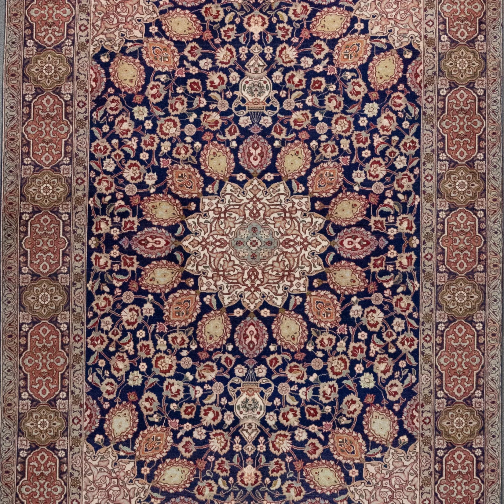 Enhance Your Space with Classic FLORAL Beauty. This beautiful TABRIZ rug, crafted in a classic FLORAL style, brings a warm, welcoming feel to your home. The rich NAVY background, combined with its elegant BEIGE border, creates a bold yet timeless look. The soft colors and intricate design make this rug perfect for adding character and style to your living room, dining area, or any space that needs a fresh update. Sourced from PERSIAN, this handmade rug is not only a stunning decorative piece but also a valuable investment in quality craftsmanship. Measuring 4' 8" x 6' 8" (imperial) or 142 x 203 (metric), its durable construction ensures it will last for years, making it a timeless addition to your decor.