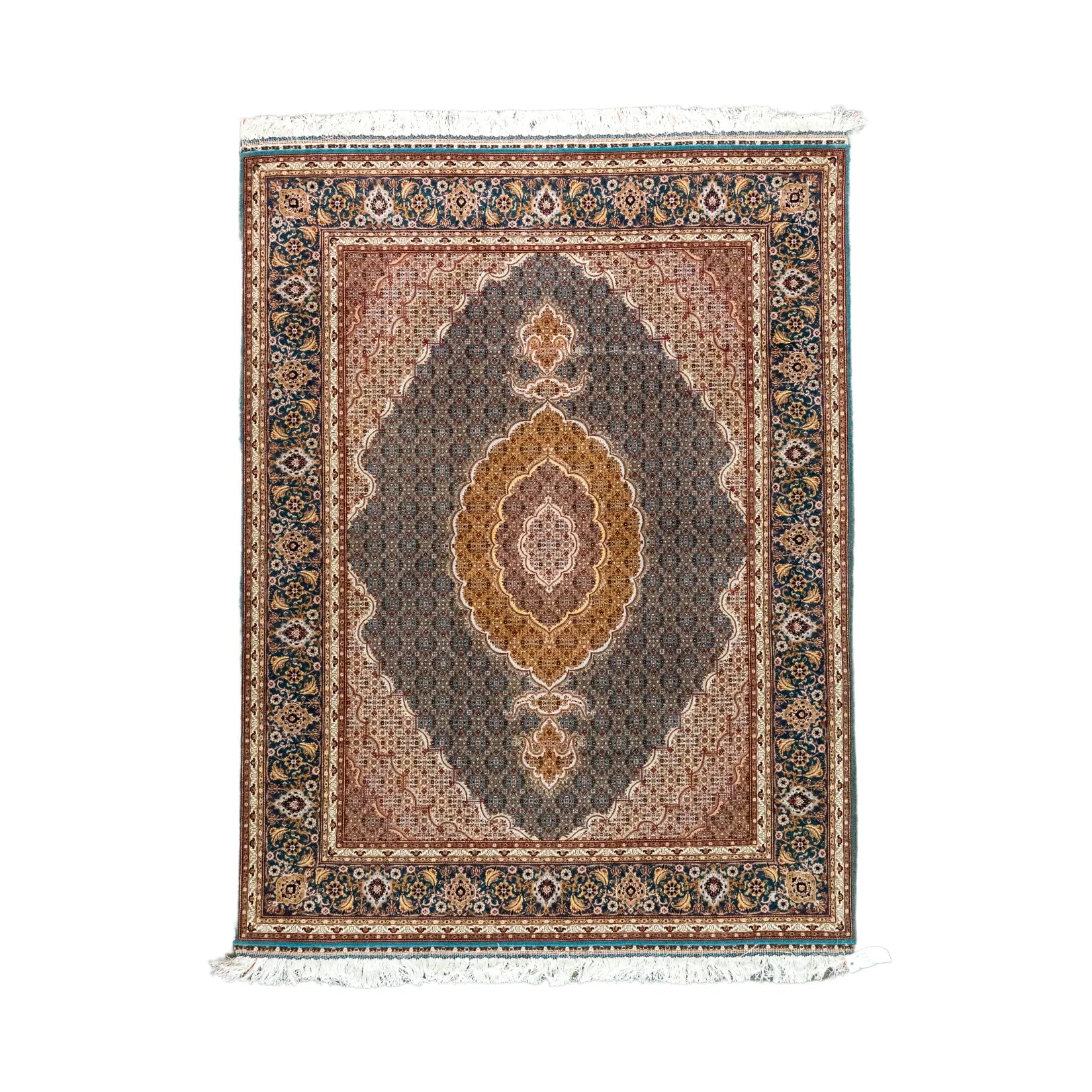 Elevate Your Space with Timeless FISH DESIGN. This elegant TABRIZ rug, featuring the distinctive fish design, brings a touch of heritage and artistry to your home. The intricate patterns on the GREEN background symbolize movement and harmony, making it a perfect centerpiece for any room. The MULTICOLOR border adds a sophisticated contrast, framing the detailed design beautifully. Whether displayed in your living room, study, or any formal space, this rug enhances the ambiance with its rich cultural significance. Handcrafted in PERSIAN, this rug is not only a stylish addition but also a lasting investment in quality and tradition. Measuring 5' 1" x 6' 7" (imperial) or 155 x 200 (metric), it offers durability and elegance that will elevate your space for years to come.