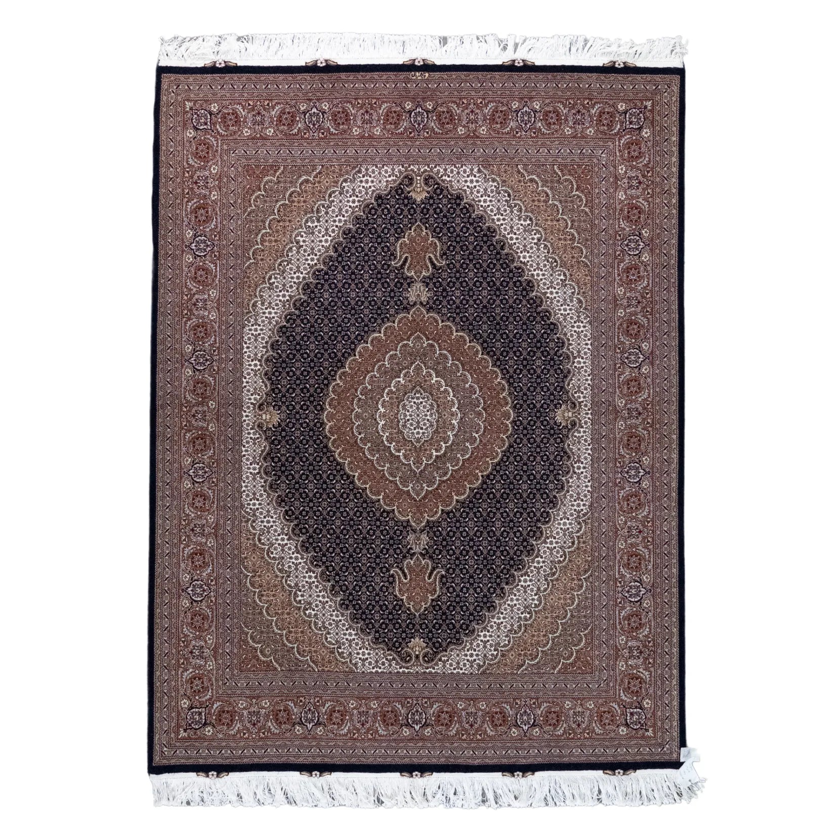 Elevate Your Space with Timeless FISH DESIGN. This elegant TABRIZ rug, featuring the distinctive fish design, brings a touch of heritage and artistry to your home. The intricate patterns on the NAVY background symbolize movement and harmony, making it a perfect centerpiece for any room. The ROSE border adds a sophisticated contrast, framing the detailed design beautifully. Whether displayed in your living room, study, or any formal space, this rug enhances the ambiance with its rich cultural significance. Handcrafted in PERSIAN, this rug is not only a stylish addition but also a lasting investment in quality and tradition. Measuring 5' 1" x 6' 9" (imperial) or 155 x 206 (metric), it offers durability and elegance that will elevate your space for years to come.
